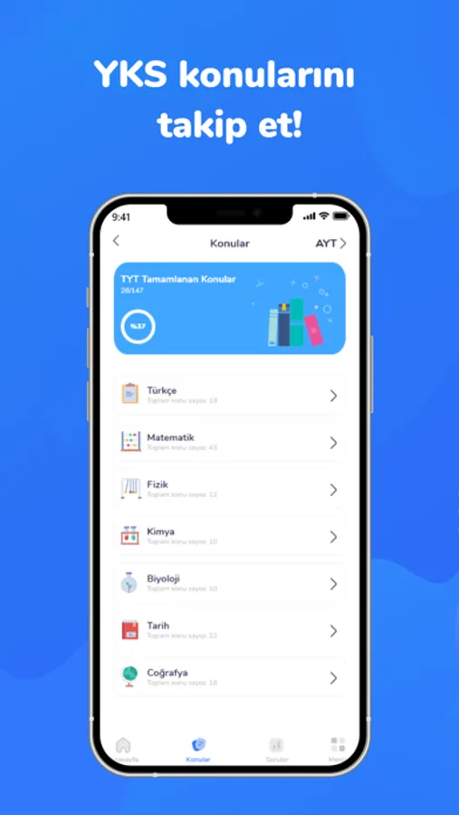 Sınavdaki tüm konuları gör, bitirdiğin konuları işaretle ne kadar ilerleme kaydettiğini anlık olarak takip et böylece ne durumda olduğunu her an takip et.