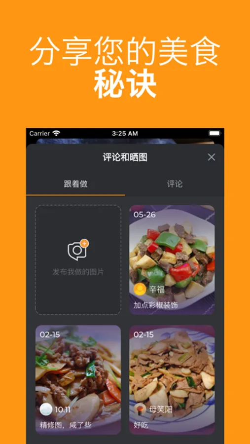 ■ 评论和晒图:分享您做的成品到“晒图”,或者您对菜谱有任何独到的意见和疑惑,都可以发布到厨易社区贡献您的反馈。