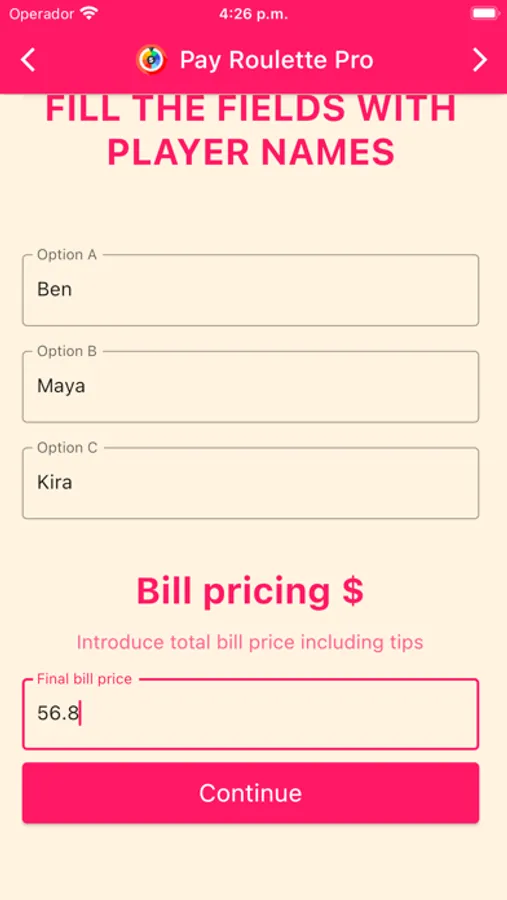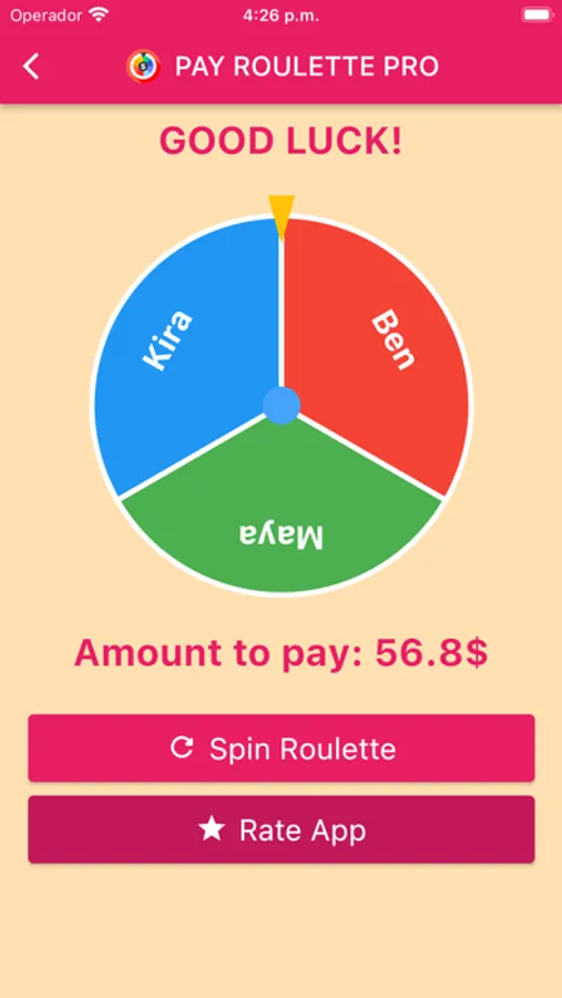 Pretty simple and fast to use, just choose how many players / dinners are playing. After this fill their names and the final price of the bill. Then the best step! Just choose someone to spin the roulette and check the result!