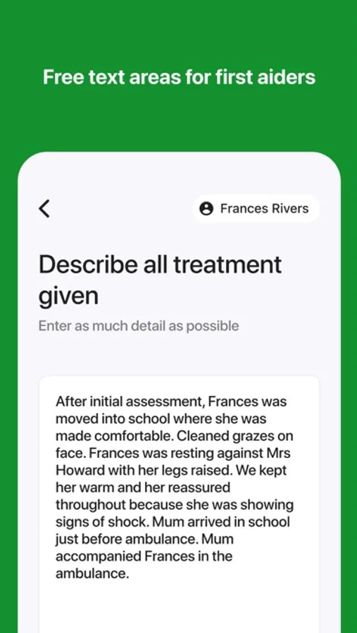 Use the free text areas to describe the incident, the treatment given and any recommended follow up.