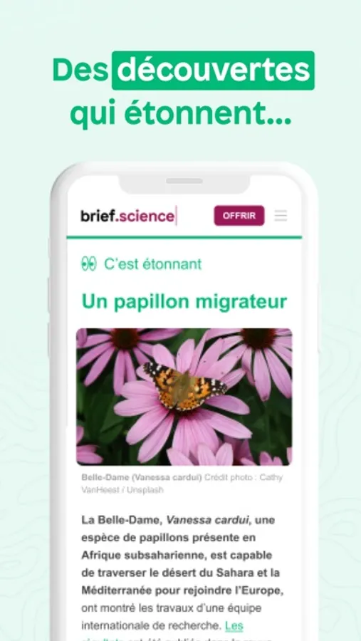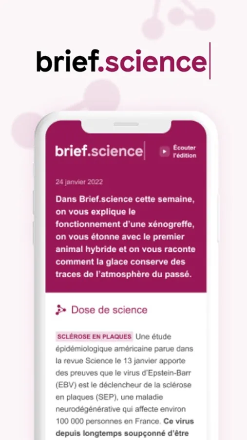 - Une édition par semaine : chaque vendredi à 12h30, Brief.science récapitule les dernières découvertes marquantes et explique un sujet qui fait l’actualité scientifique, avec rigueur, curiosité et sans publicité.