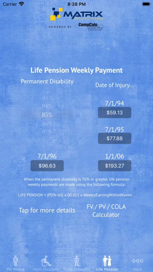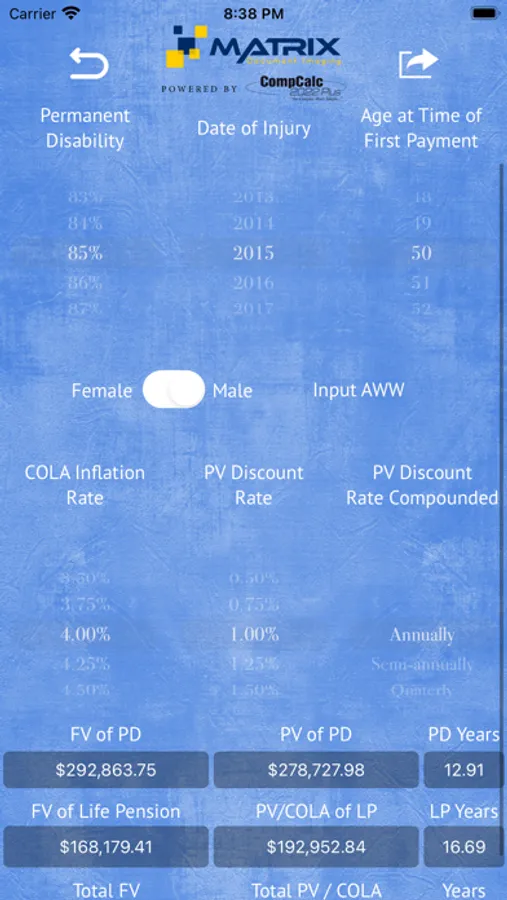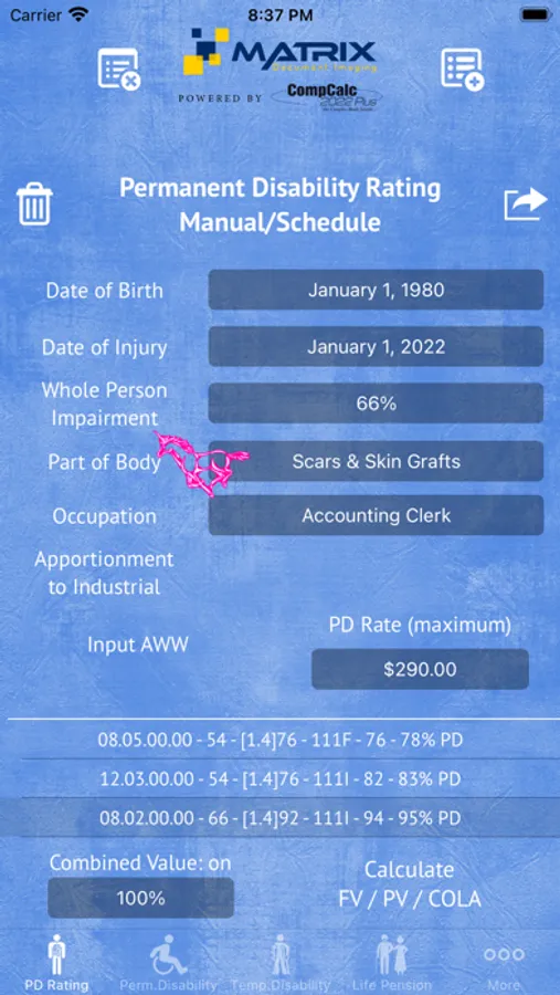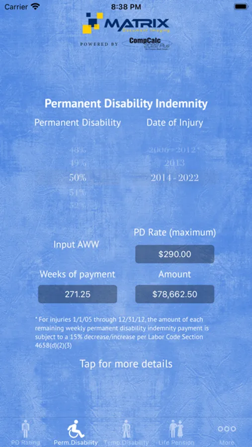 MatrixCompCalc is a California Workers' Indemnity Calculator that includes: