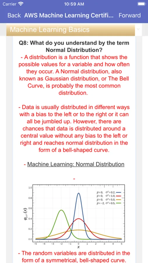 The App covers Machine Learning Basics and Advanced topics including: NLP, Computer Vision, Python, linear regression, logistic regression, Sampling, dataset, statistical interaction, selection bias, non-Gaussian distribution, bias-variance trade-off, Normal Distribution, correlation and covariance, Point Estimates and Confidence Interval, A/B Testing, p-value, statistical power of sensitivity, over-fitting and under-fitting, regularization, Law of Large Numbers, Confounding Variables, Survivorship Bias, univariate, bivariate and multivariate, Resampling, ROC curve, TF/IDF vectorization, Cluster Sampling, etc.