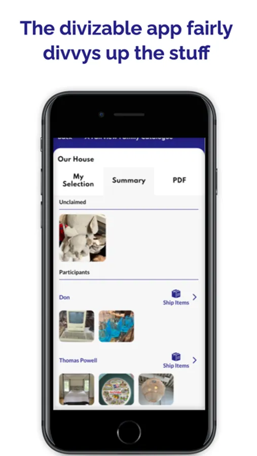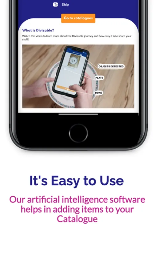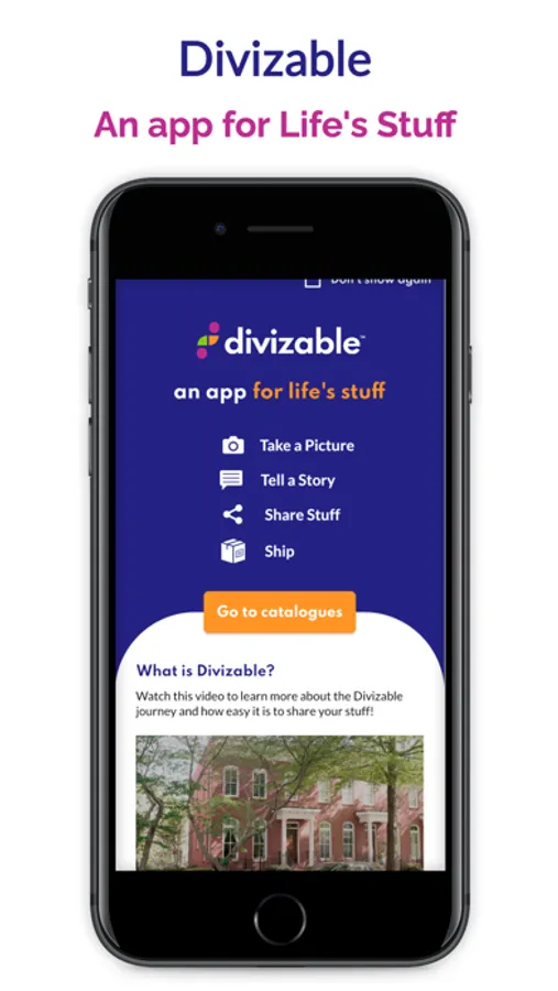 Divizable is an app that creates family and personal catalogues of household property and personal items. The divizable app allows you to create catalogues using the camera on your phone to organize items, share memories, text with friends and family using our group chat and create shipping labels to send items that you want to share with others, give away, or sell. The divizable app uses Google's ML Vision to easily identify items using AI technology. It also has a built in ruler that uses an augmented reality based ruler to measure the dimensions of items. The app also has an API from ShipEngineTM that makes it easy to create shipping labels for the items.