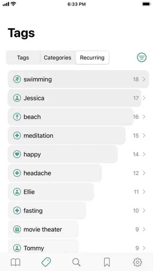 Tags allow you to keep track of the people you interacted with, the places you've been, the sports you've played or feelings you've experienced. You are free to create as many tags as you like. The app will also help you to automatically assign tags with the "auto tags" feature.