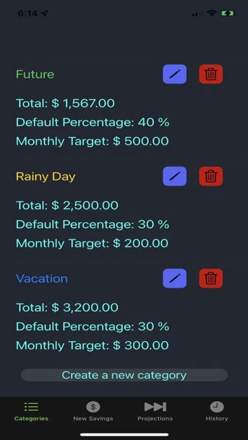 • Organize your savings goals by separating them into different categories. These can be created, deleted, and updated at any time.
