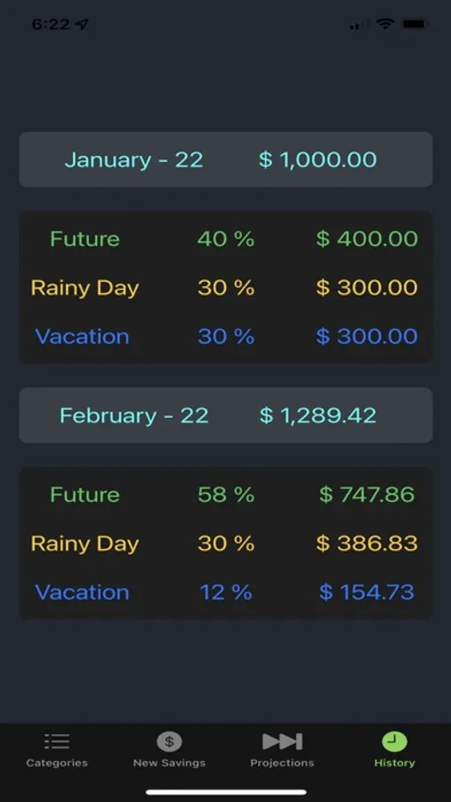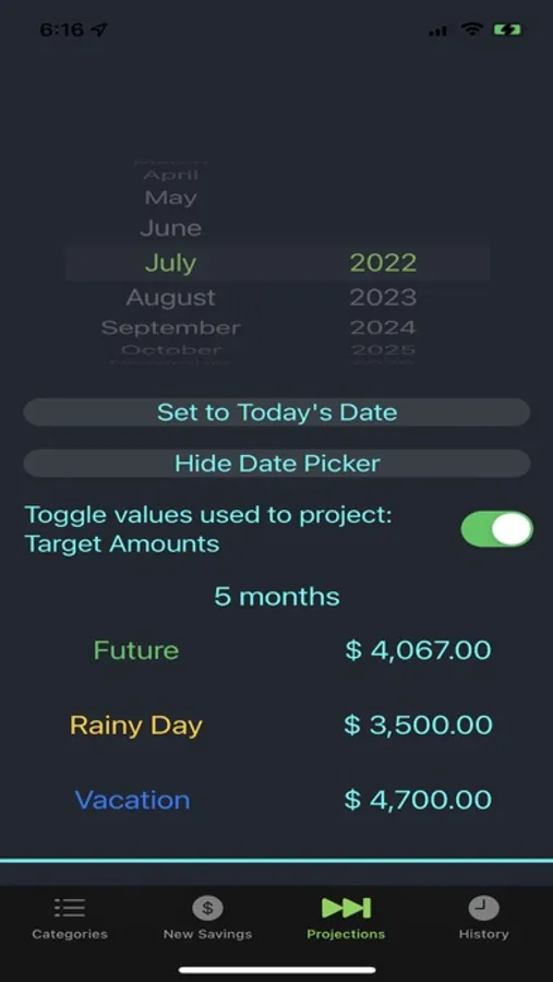 • Project the values of your savings categories to help you plan for the future and see other saving scenarios.