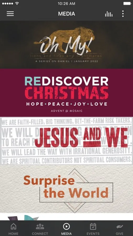 Stay connected with the day-to-day life of Mosaic Church! You can: watch or listen to past messages; stay up to date with push notifications; share your favorite messages via Twitter, Facebook, or email; and download messages for offline listening.