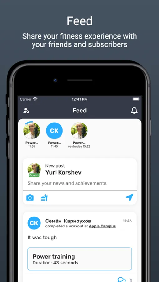 Use the workout planner to plan your workout using our database of thousands of exercises with videos and photos. Go through the workout doing the planned exercises step by step, recording your results for each set of each exercise. Our system will automatically set run and rest timers. You can spice up your workout with media content from your photo gallery or camera. Other users will be able to view your workout progress online as a story. Share your workout in the feed to your friends and followers.