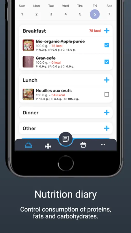 Use the nutrition diary to track your proteins, fats and carbohydrates consumption throughout the day. The system will automatically calculate your daily intake and convert the consumed nutrients into kilocalories. Share your meal in the feed for your followers or for your coach.