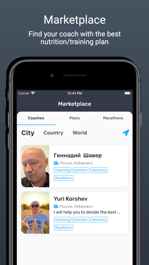 Are you looking for a coach? You can find a coach in your region or city using our marketplace. You can give your trainer access to your nutrition diary and workouts planner, allowing him to control your nutrition and activity online. The coach can make diets for you and plan workouts, and you will simply mark your performance. Based on your results, the coach will make new recommendations. On the marketplace, you can also buy a ready-made nutrition/workout plan or participate in a marathon, competing with other users.