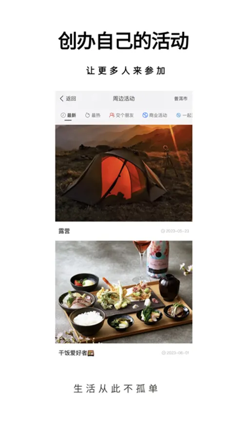 人与人之间最好的联系方式就是面对面交流。因此我们提供了建立活动的功能。您可以在APP里创建一个免费或者收费的活动,邀请其他用户参加。您也可以发现周边各种各样有趣的线下活动去参加。这将为您提供一个更加直接的社交体验,也将让您认识更多志同道合的朋友。