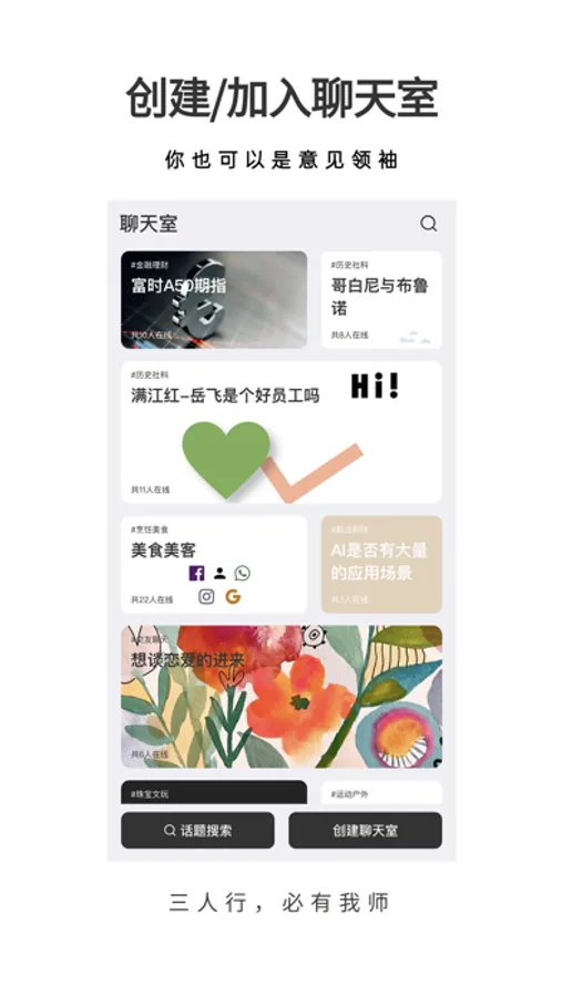 如果您不喜欢拍视频又想在网络上发表自己的观点成为意见领袖,您可以在这里建立自己的公开或私人的聊天室,可以与其他人交流,分享和发现新的观点和内容。