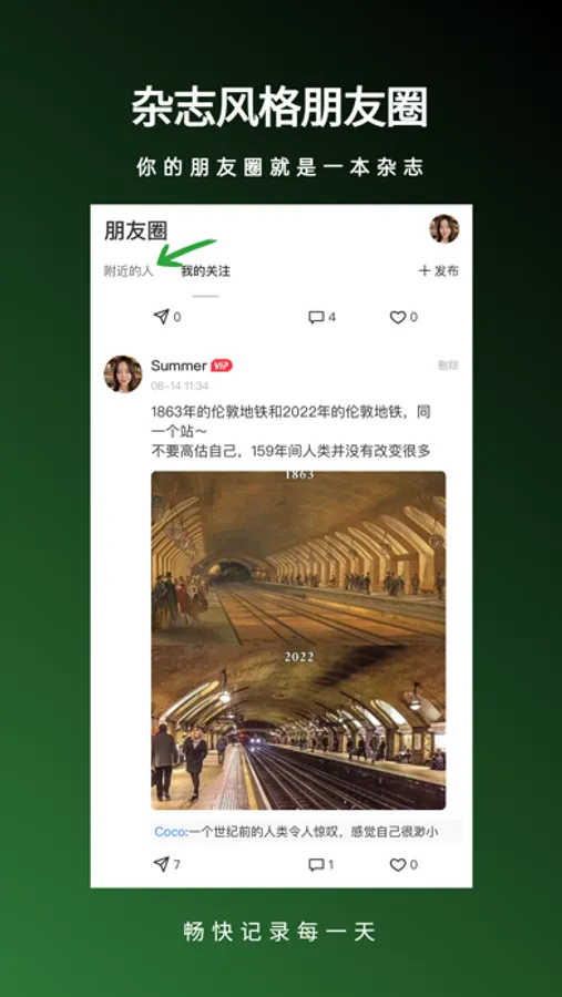 在这里,您可以很容易的认识附近的人,可以看到附件人的朋友圈,也可以随时和他们打招呼。