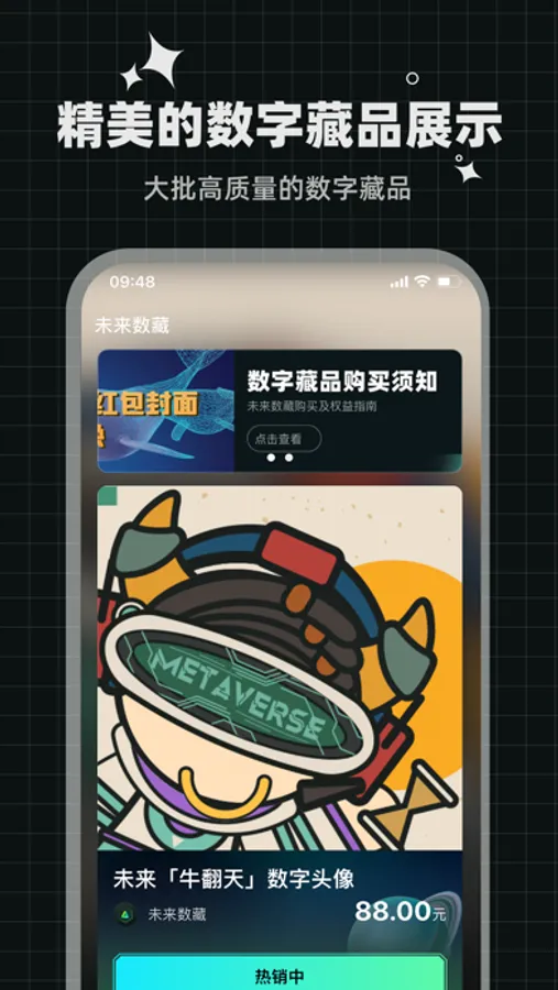未来数藏是一款优质的数字藏品APP,旨在为广大用户提供立足于中国特色,面向全球的数字藏品交易平台。未来数藏基于区块链技术,每个数字藏品从诞生起就与特定的作品、艺术品或商品建立唯一的映射关系,保证其真实性和稀缺性。