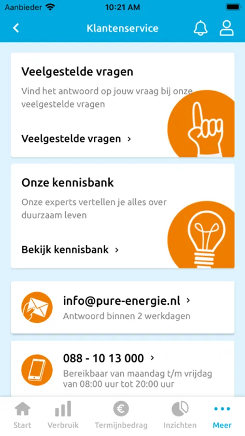 Verder kun je in de Pure Energie App je meterstanden doorgeven, facturen bekijken, contractdetails zoals tarieven opzoeken, berichten vinden, een verhuizing doorgeven of toch even in contact komen met onze afdeling Klantgeluk. We helpen je graag.
