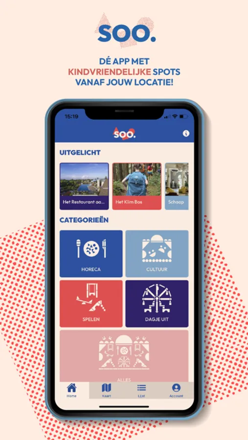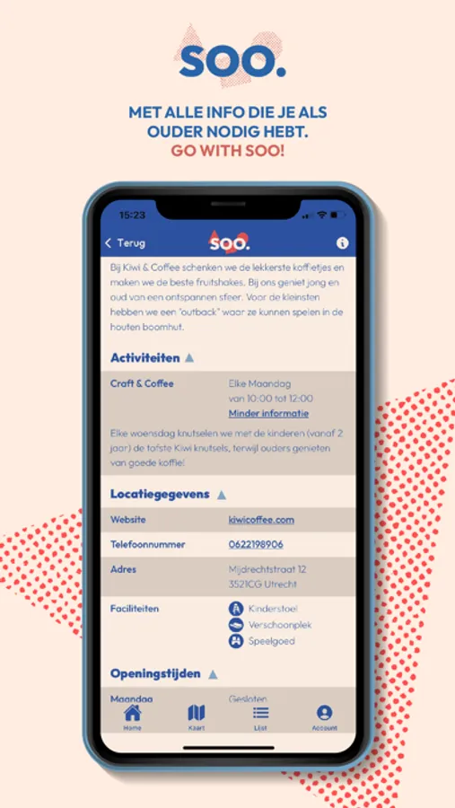 SOO is dé app voor iedereen die iets leuks wil doen met kinderen. Van restaurant tot museum en van speeltuin tot dagje uit. SOO laat gemakkelijk alle kindvriendelijke spots bij jou in de buurt zien. Alle locaties die SOO toont zijn geverifieerd, daardoor weet je zeker dat je altijd welkom bent met kinderen.