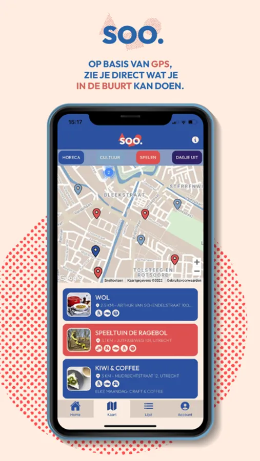 SOO werkt met GPS. Op basis van jouw locatie, zie je direct wat je in de buurt met kinderen kan doen. Je hoeft niet meer te zoeken, alleen te gaan.