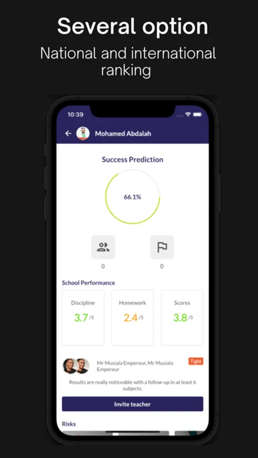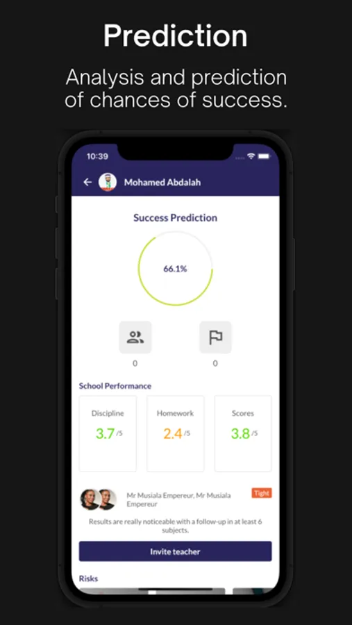 Eska is an application for improving school performance. It gives a figures view of the kids’ work. Eska relies on artificial intelligence which analyzes the student's environmental data and crosses them with his school evolution to predict his chances of success, and assess the risks to which he is potentially exposed to : Alcohol, Drugs, Pregnancy, etc.