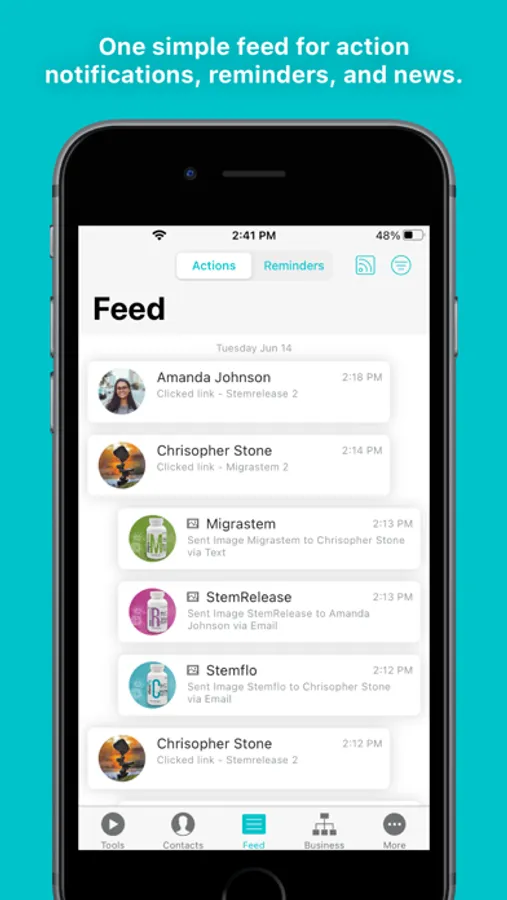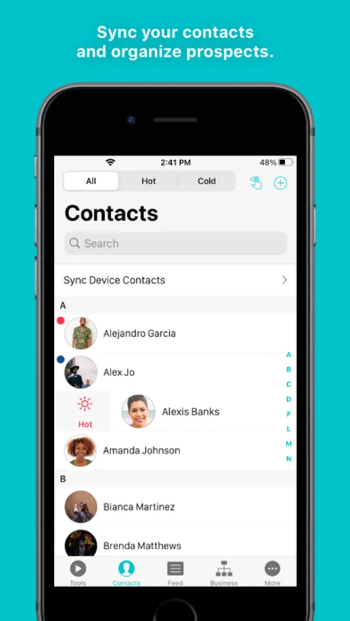 Contacts: Choose how to sync and manage your contacts. Swipe to sort them by interest level. You can make connections, add notes, or check out the Contact Feed to see the tools you’ve shared and contact actions.