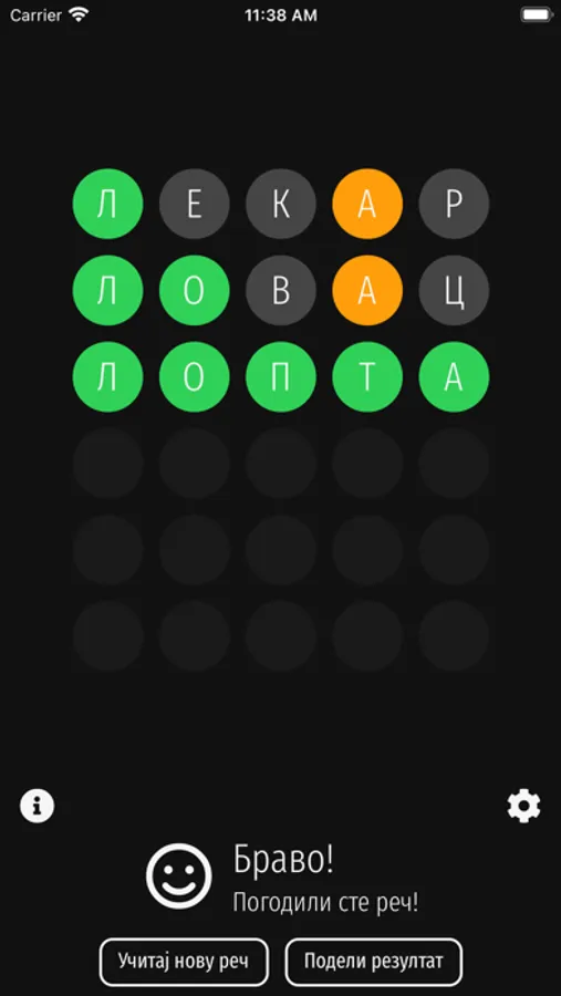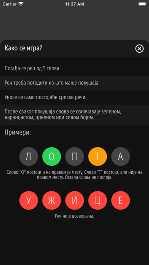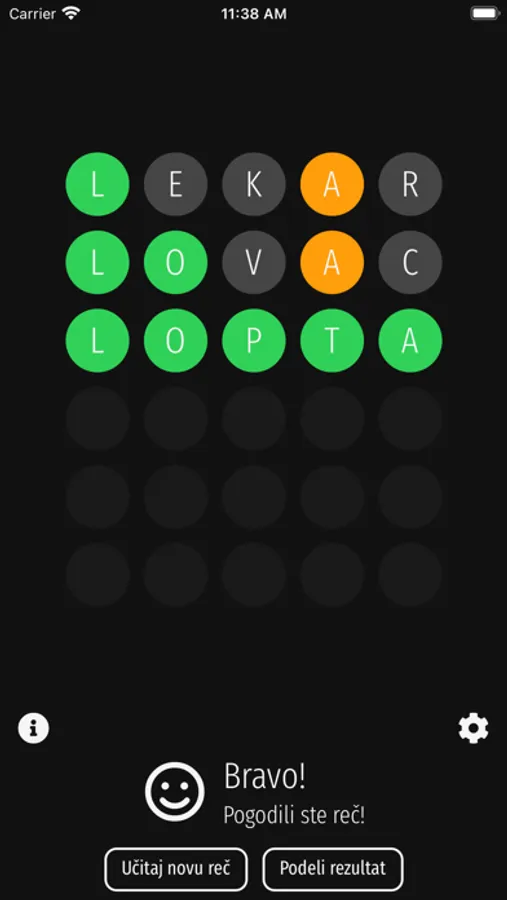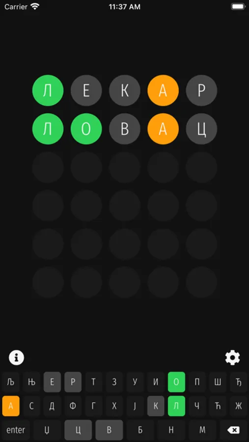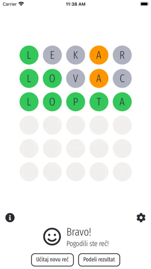 - Posle svakog pokušaja slova se označavaju zelenom, narandžastom, crvenom ili sivom bojom.