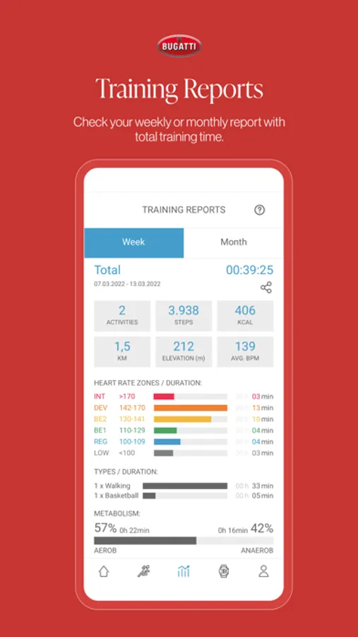Training Report: Check your weekly or monthly report with total training time, calories burned, training zones, and more.