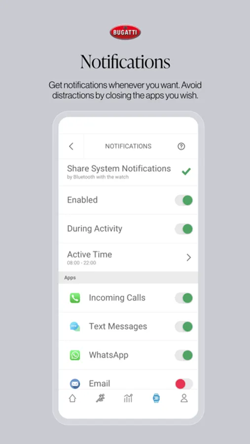 This masterpiece is for those who enrich their Bugatti Experience. Take a dive into Bugatti Smartwatches App to take control of all the features that you would like to uncover. This high-tech application contains all the functionality of the mobile world has. We design it to work in perfect harmony with your Bugatti Smartwatches.