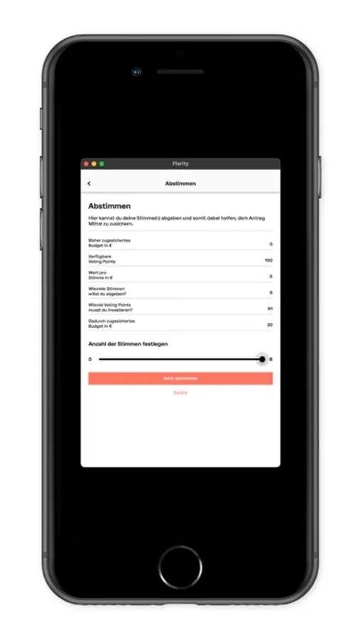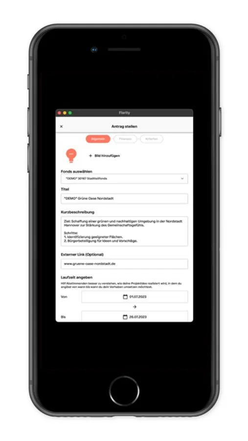 Applicants can find funding funds on the app and can submit their project applications directly in the app. You will be notified as soon as your application is accepted or rejected. If they are part of the decision-making group (optional), they can also vote for their application themselves (e.g. in a district fund). Fund management is also planned, with which the promised funds can be processed directly via the app (wallet).