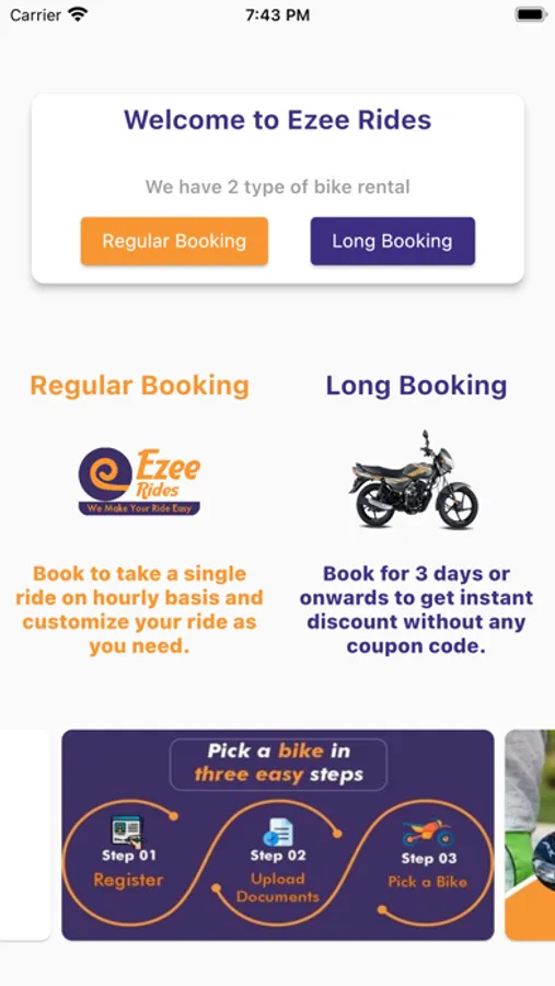 Ezee Rides provides activa and bikes on rent facilities for a regular and long term rides. With amazing offers and no add-on charges for 2 helmets, this platform has aimed to make self-drive two-wheelers accessible to people across India and help them enjoy a bike ride experience without having the hassles of owning and maintaining one. The booking can be done from application. It also has an application for the vendors through which they can manage their fleet and accounts. Rent a bike or scooty with most flexible daily, weekly & monthly Ezee Rides rental plans at most affordable price with ultimate advantage of free helmet & easy booking quality bikes. Online booking, sanitized vehicles, free coupons, referral codes and multi days advantageous rides