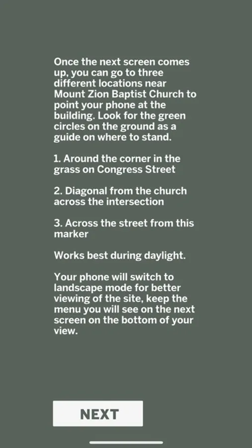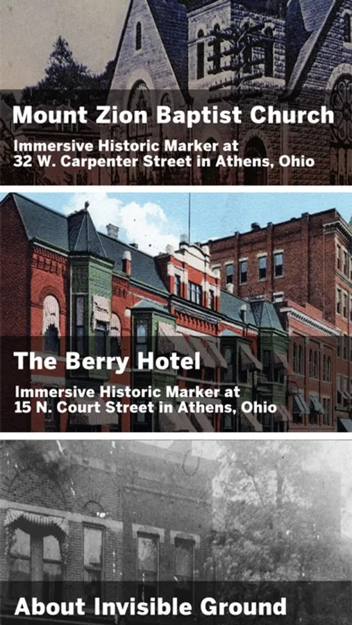The Invisible Ground app works with an Immersive Historic Marker in Athens, Ohio to let visitors see present-day locations through an augmented reality experience that puts the historic sites on the camera view of their device. Currently, this works at two locations: across the street from the former Berry Hotel at 15 N. Court Street, Mount Zion Baptist Church at 32 W. Carpenter Street, and the Athens County Courthouse at 1 S. Court Street. At Mount Zion and the Courthouse look for green circles on the ground around the intersection and across the street from the buildings to activate different photos, for the Berry Hotel, just point it at the Diner. All sites also have audio orientations available for each location and there is a full podcast episode available too! look for more markers and podcasts soon, visit www.findinvisibleground.com to learn more.