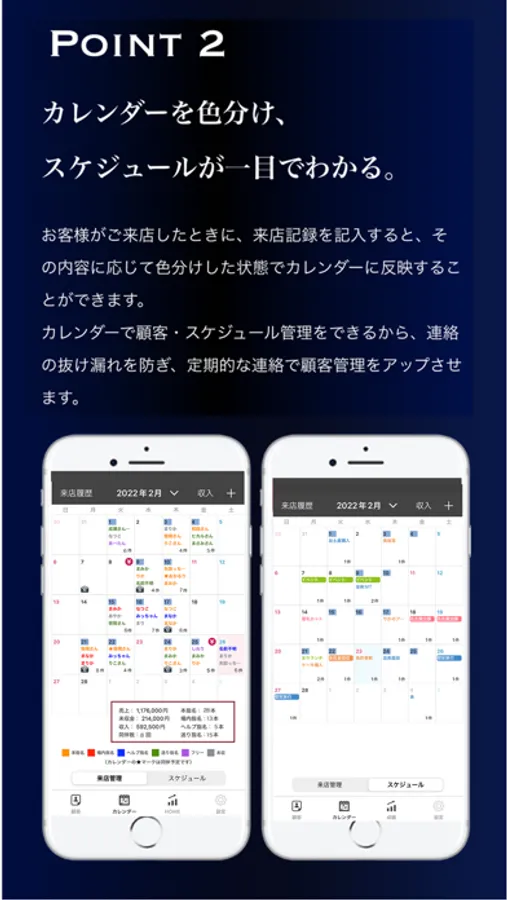 お客様がご来店したときに、来店記録を記入すると、その内容に応じて色分けした状態でカレンダーに反映することができます。カレンダーで顧客・スケジュール管理をできるから、連絡の抜け漏れを防ぎ、定期的な連絡で顧客管理をアップさせます。