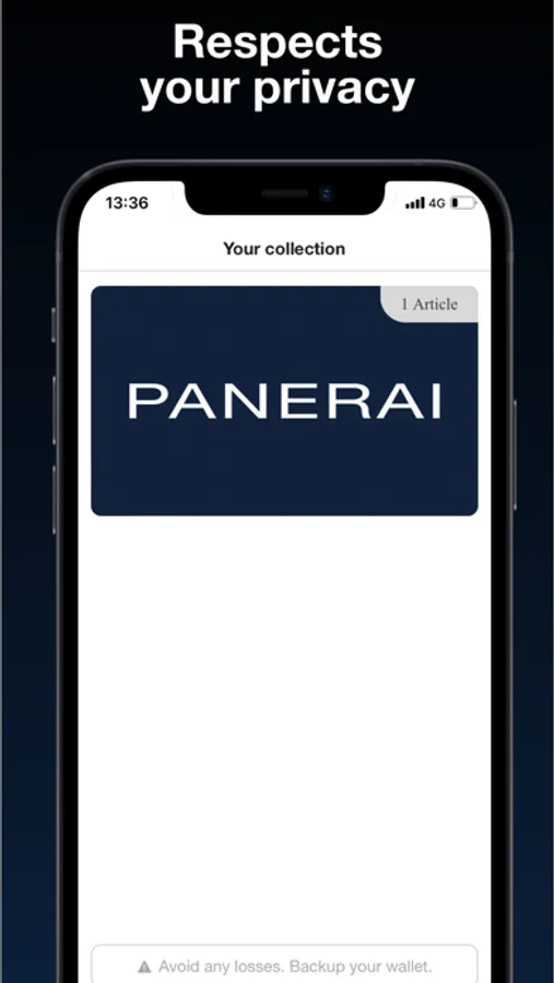 The Panerai Digital Wallet is a unique cryptographic wallet developed by Arianee, allowing its owners to store and truly own their non-fungible tokens. Built upon web3 infrastructure, the Panerai Digital Wallet allows complete control of personal data without tracking.