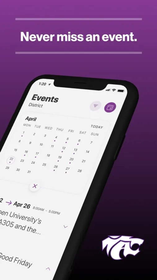 The event section shows a list of events throughout the district. Users can add an event to their calendar to share the event with friends and family with one tap.