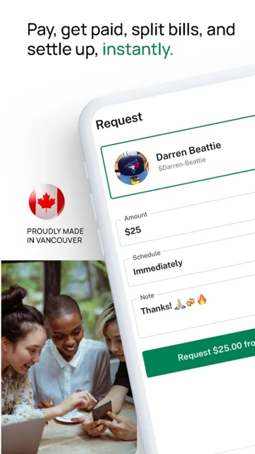 Payments are everywhere. They drive our lives. They connect us. Yet there hasn’t been one single Canadian payment platform that makes it possible to send, receive, split, and track payments for everything from one-to-one social payments and auto-scheduled deposits, to group bill splits and QR code-based payments.
