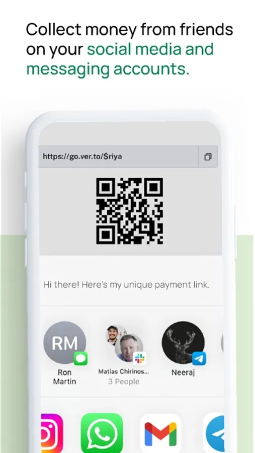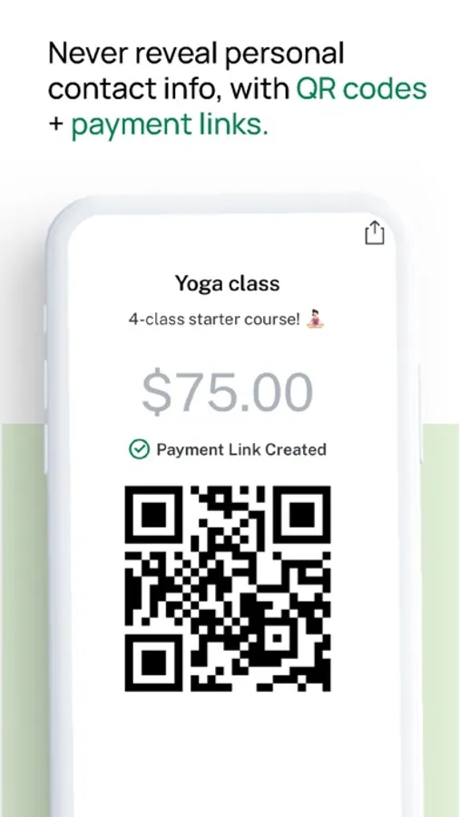 QR codes offer contactless, anonymized payments. Show or share your QR to get instantly paid securely.