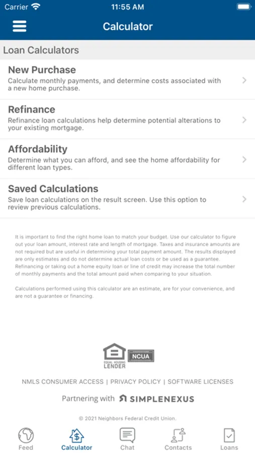 The calculations provided by the Neighbors FCU Mortgage Mobile App are useful in giving you an idea of what homeownership might mean for you. However, please be sure to contact your Neighbors Loan Officer for a customized solution tailored to your specific financial situation, needs, and goals. Your Loan Officer can also assist you with any questions you have about your loan and loan approval process.Let Neighbors FCU show you how simple securing a home loan can be.