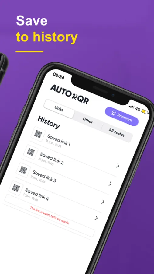 You can scan almost any QR code, give it a try. Each scanned or generated code is stored in one of the bookmark sections: 'Other' and 'All', also by tapping on a code you can see detailed info or navigate to a link stored in it. Personalize your own QR code with a link or a text message. Put QR code over a photo.