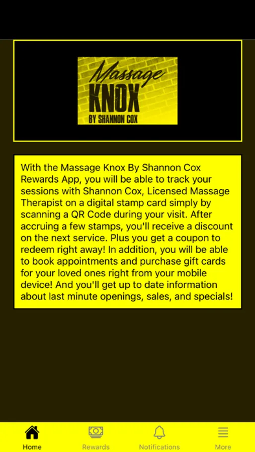 Download the Massage Knox By Shannon Cox App and start saving now! The free app contains a coupon for a discount on your very next massage! And you can continue to save with a rewards stamp card and other special offers! Get notified of last minute openings, sales and specials!