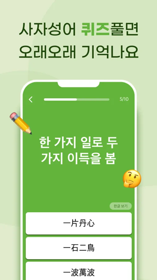 사자성어 학습하기 기능으로 퀴즈를 풀어 온전한 내 지식을 만들 수 있게 도와줍니다.