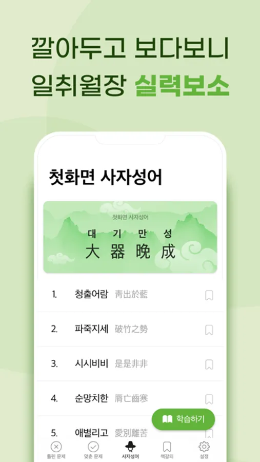 깔끔한 디자인과 학습하기, 오답 체크, 위젯 기능으로 따로 시간 내지 말고 자연스럽게 사자성어를 습득하세요!