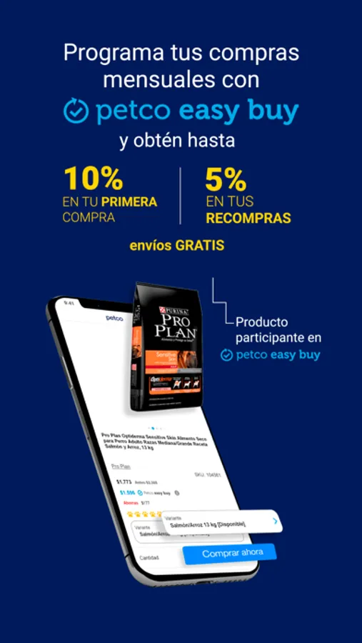 • Programa las recompras de tus productos preferidos con Petco Easy Buy.