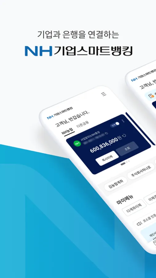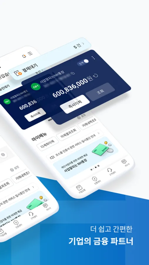NH기업스마트뱅킹은 조회, 이체, 결재/승인 등 농협의 다양한 기업금융업무를 이용하실 수 있는 서비스입니다.