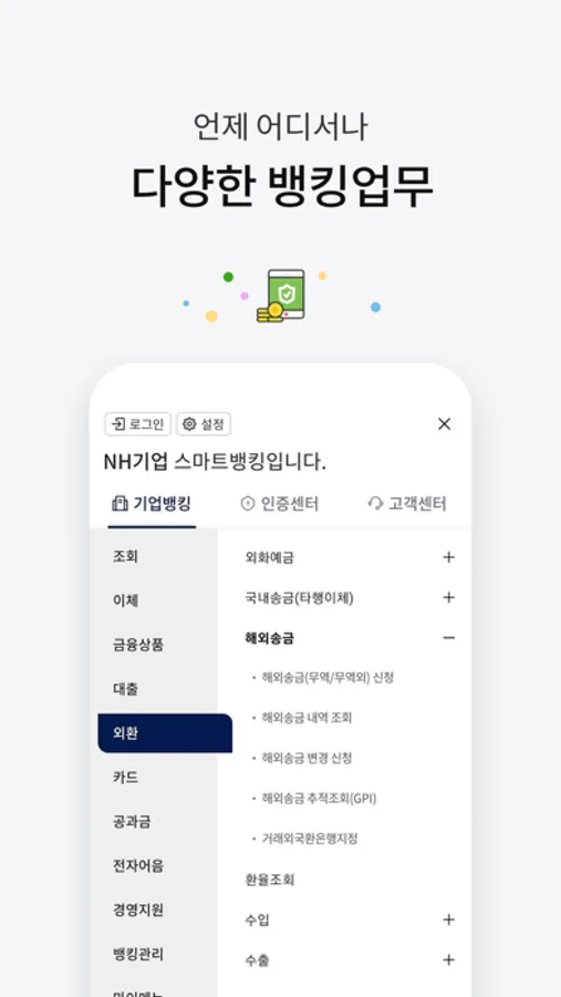 ⁻ 외환 : 외화예금조회, 국내송금(타행이체), 해외송금, 환율조회, 수입, 수출 등