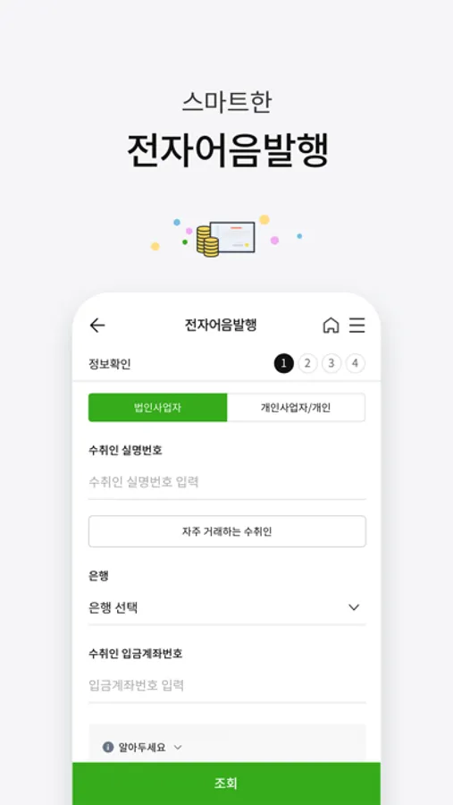 ⁻ 전자어음 : 발행인조회, 수취/배서인조회, 전자어음수취, 전자어음발생/배서 등