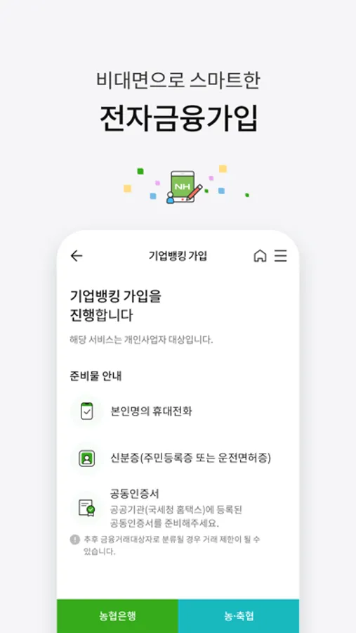 - 영업점을 방문하여 기업인터넷뱅킹 및 NH기업스마트뱅킹가입