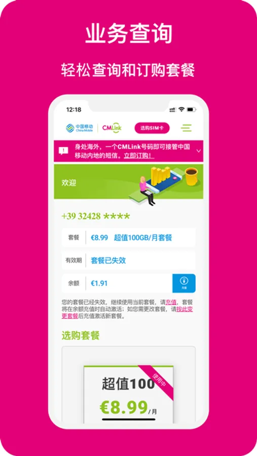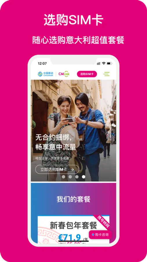 CMLink IT是中国移动面向CMLink意大利用户推出的手机APP,为意大利用户提供涵盖选购SIM卡、办理一卡多号、充值手机话费、查询套餐余量,订购套餐和叠加包等服务。