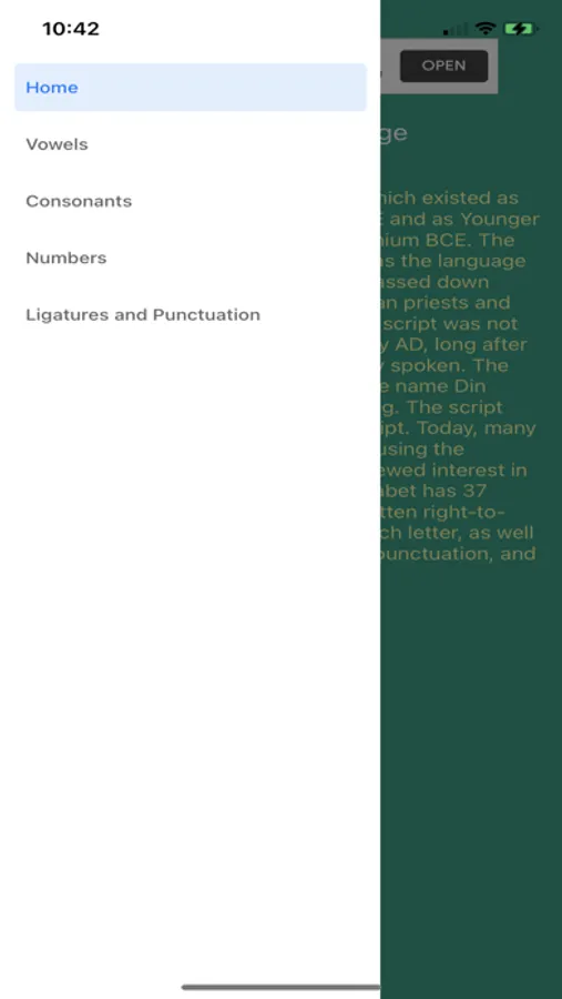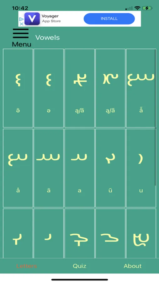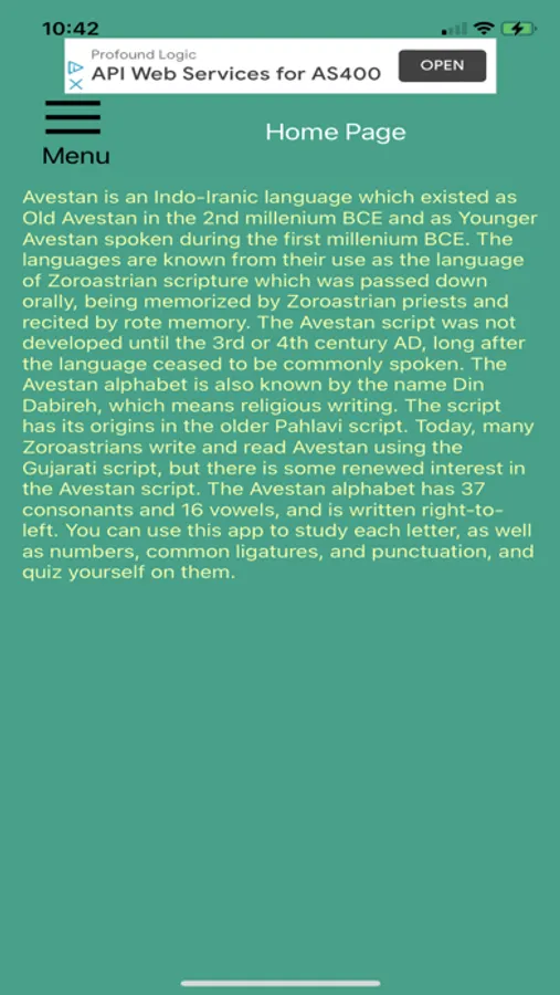 The Avestan alphabet has 37 consonants and 16 vowels, and is written right-to-left. You can use this app to study each letter, as well as numbers, common ligatures, and punctuation, and quiz yourself on them.