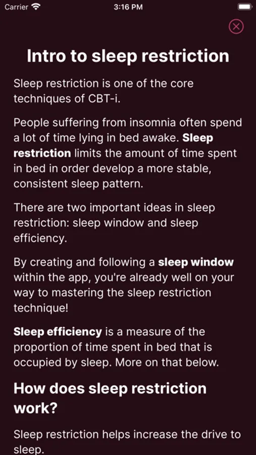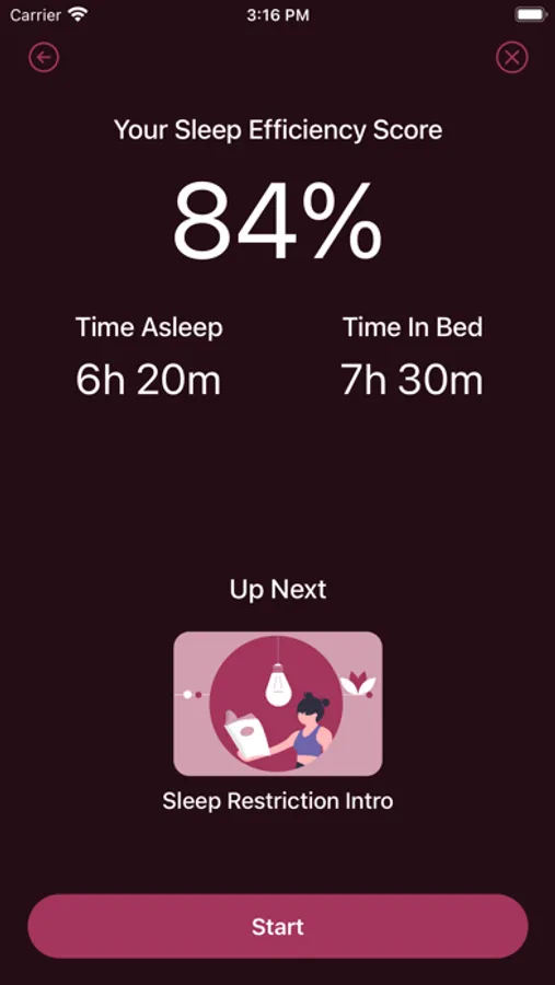 Restful teaches advanced techniques such as sleep restriction, sleep windows, stimulus control, sleep hygiene, relaxation techniques, and cognitive restructuring. Record your sleep diary each day to get your sleep efficiency score and track events influenced your sleep quality. After each entry, do one lesson and over the course of several weeks, complete the whole course to optimize your sleep efficiency.