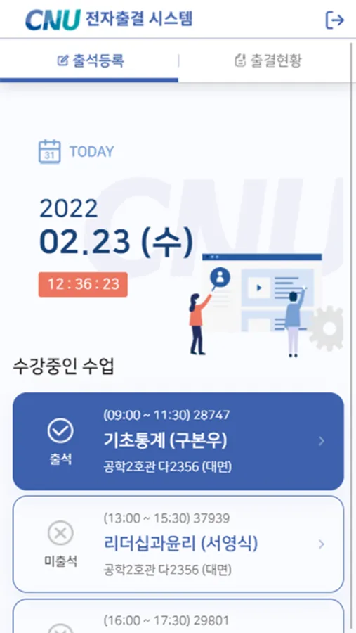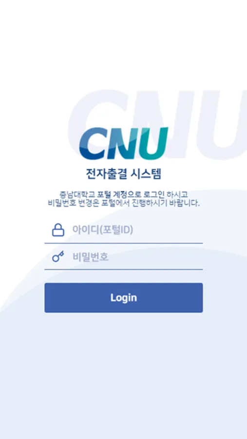 충남대학교의 전자출결 모바일 서비스로 학생 수강 과목에 대한 전자출결 기능을 사용할 수 있습니다.