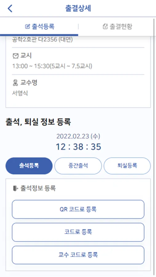 - 과목을 선택하여 현재 수업에 대한 전자출결 기능을 사용할 수 있습니다.